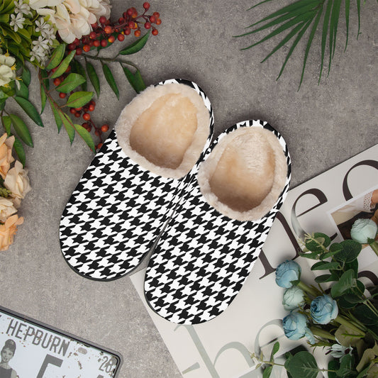 Houndstooth Fluffy Slippers, Black White Faux Fur Fuzzy Puffy Women Ladies Men House Slide Bedroom Warm Winter Cozy Designer Slip On Shoes