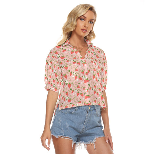 Strawberry Women Button Up V-Neck Shirt, Pink Floral Flowers Short Sleeve Print Casual Chest Pockets Fruit Ladies Collared Designer Blouse