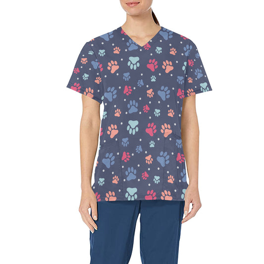 Paws Medical Scrubs Top Women, Pet Dog Cats Ladies Female Plus Size Nursing Cute Printed Nurse Vet Veterinary Tech Uniform V Neck Pockets