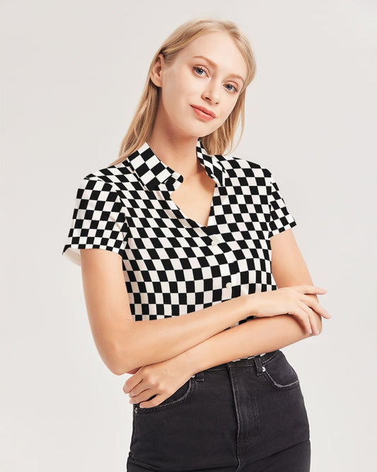 Black White Checkered Women Button Up Shirt, Racing Check Short Sleeve Print Buttoned Down Summer Ladies Collared Designer Dress Blouse Top