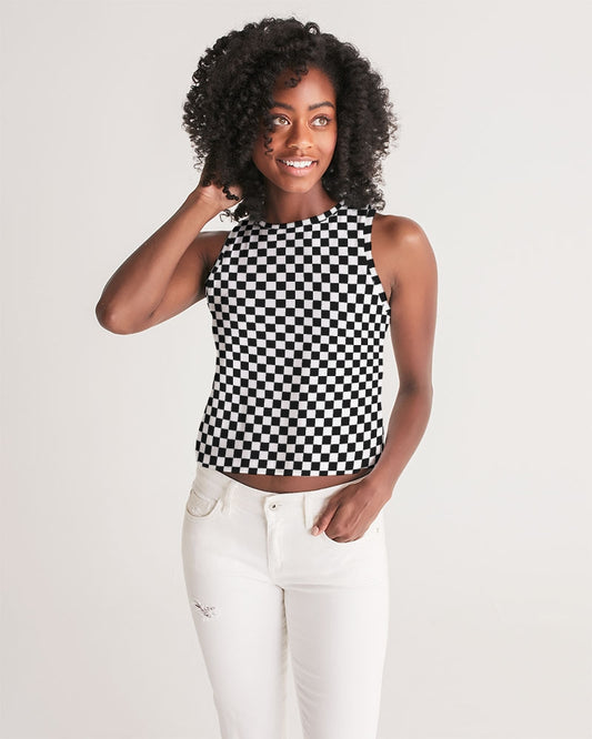 Black White Checkered Women Tank Top, Racing Flag Check Festival Yoga Workout Gym Sexy Summer Muscle Sleeveless Shirt