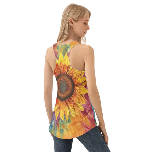 Sunflower Tie Dye Women Tank Top, Yellow Floral Flower Festival Yoga Workout Ladies Summer Muscle Sleeveless Female Designer Shirt Tee
