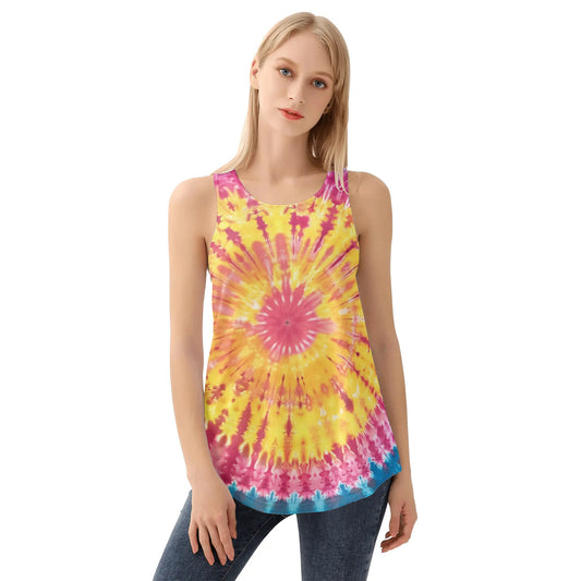 Tie Dye Women Tank Top, Yellow Pink Flower Festival Yoga Workout Ladies Summer Muscle Sleeveless Female Designer Shirt Tee