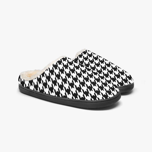 Houndstooth Fluffy Slippers, Black White Faux Fur Fuzzy Puffy Women Ladies Men House Slide Bedroom Warm Winter Cozy Designer Slip On Shoes