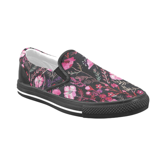Pink Floral Women Slip On Shoes, Flowers Canvas Festival Sneakers Black Low Top Casual Ladies Aesthetic Designer Flat Slide On Comfortable