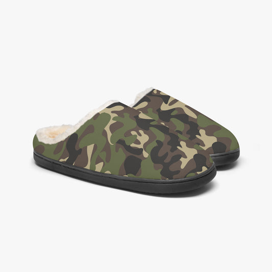 Camo Fluffy Slippers, Green Camouflage Faux Fur Fuzzy Puffy Women Men House Slide Handmade Bedroom Warm Winter Cozy Designer Slip On Shoes