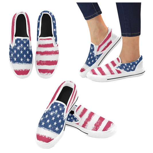 American Flag Women Shoes, Patriotic Red White Blue Mismatched Sneakers Stars and Stripes USA 4th of July Slip on Canvas Vegan Casual shoes