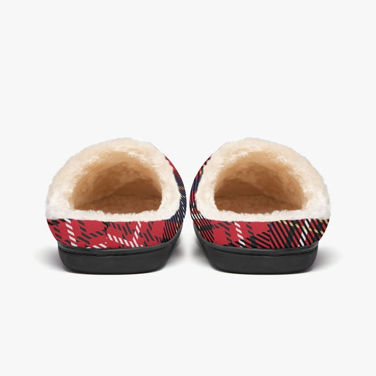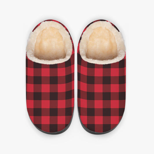 Red Buffalo Plaid Fluffy Slippers, Black Checks Faux Fur Fuzzy Puffy Women Men House Slide Bedroom Warm Winter Cozy Designer Slip On Shoes