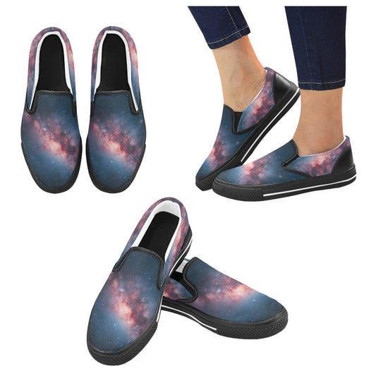 Galaxy Stars Women Slip On Shoes, Outer Space Universe Red Nebula Black Sneakers Canvas Vegan Casual Ladies Female Shoes