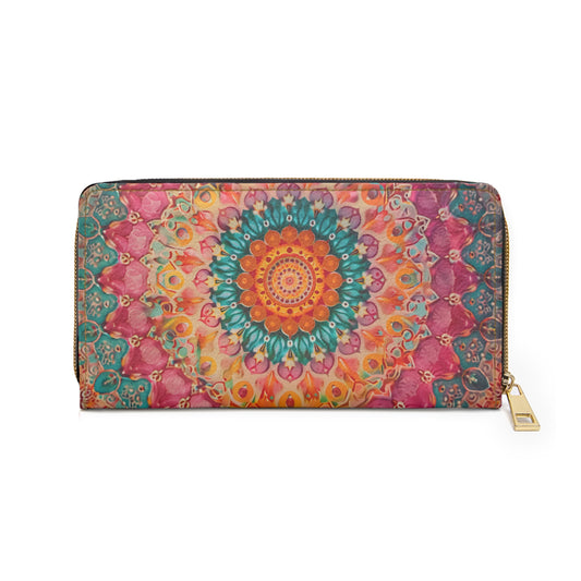 Boho Mandala Leather Wallet Women, Bohemian Ethnic Vegan Zipper Zip Around Coins Credit Cards Pocket Cash Ladies Pouch Slim Clutch Gift
