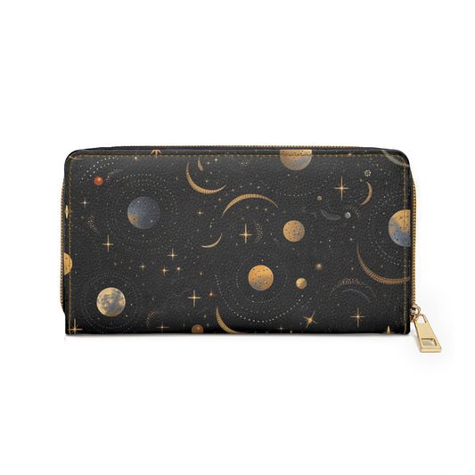 Celestial Leather Wallet Women, Moon Space Vegan Zipper Zip Around Coins Credit Cards Pocket Cash Ladies Pouch Slim Clutch Purse