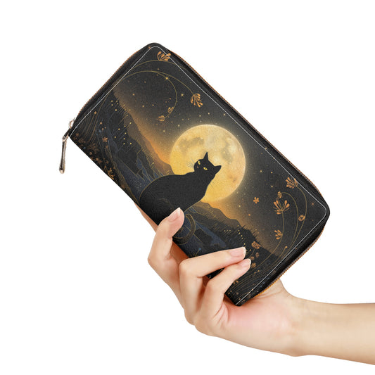 Black Cat Full Moon Leather Wallet Women, Retro Vintage Vegan Zipper Zip Around Coins Credit Cards Pocket Cash Ladies Slim Clutch Purse