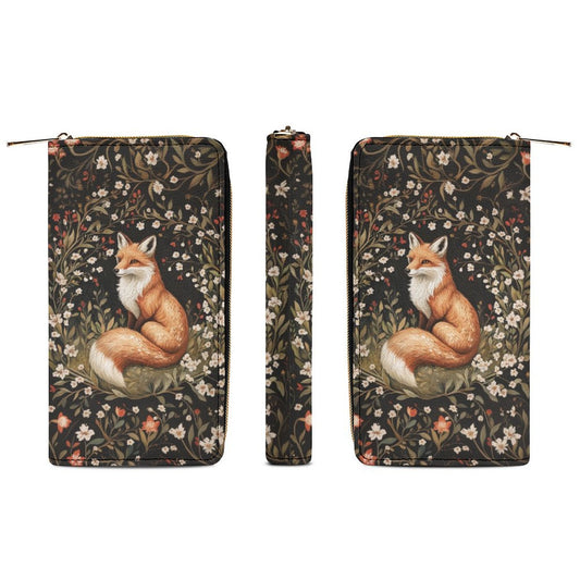 Fox in Forest Leather Wallet Women, Floral Flowers Vegan Zipper Zip Around Coins Credit Cards Pocket Cash Ladies Female Slim Clutch Purse