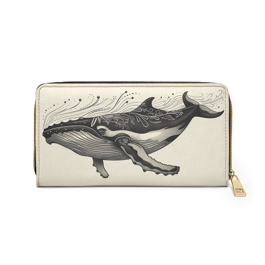 Whale Leather Wallet Women, Ocean Sea Coastal Cream Vegan Zipper Zip Around Coins Credit Cards Pocket Cash Ladies Pouch Slim Clutch Purse