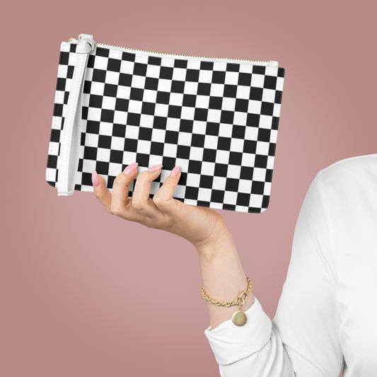 Black White Checkered Wristlet Wallet Clutch Purse, Check Bag Vegan Leather Pocket Zipper Evening Modern Strap Phone Pouch for Women