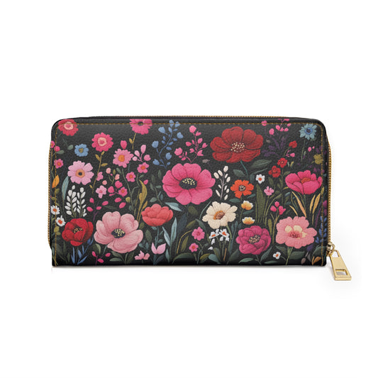 Pink Floral Leather Wallet Women, Flowers Faux Embroidery Vegan Zipper Zip Coins Credit Cards Pocket Cash Ladies Pouch Slim Clutch Purse