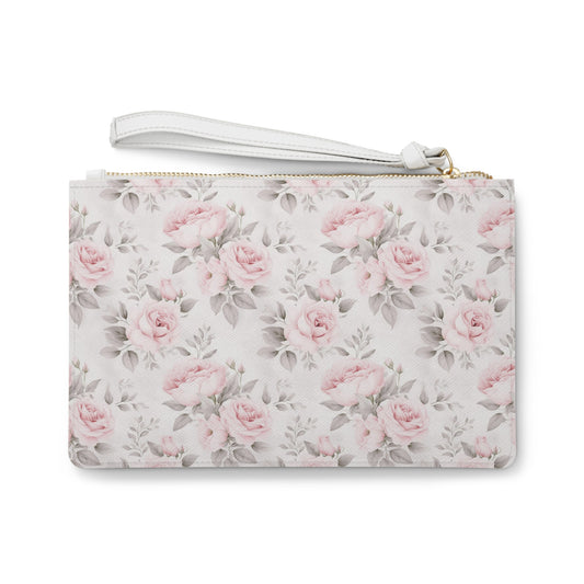 Pink Roses Clutch Wristlet Purse, White Vegan Leather with Pocket Zipper Evening Modern Bag Strap Phone Wallet for Women