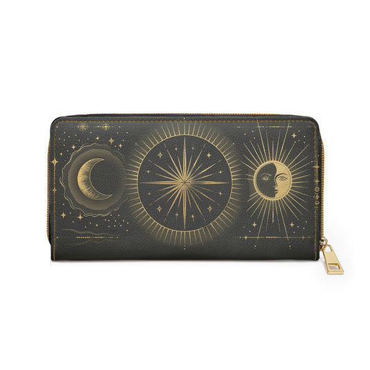 Sun Moon Leather Wallet Women, Celestial Space Stars Vegan Zipper Zip Around Coins Credit Cards Pocket Cash Ladies Pouch Slim Clutch Purse