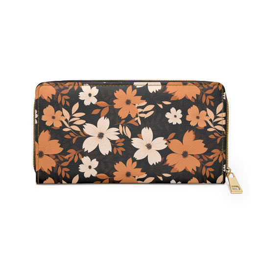 Retro Floral Leather Wallet Women, Brown 1970s 70s Vegan Zipper Zip Around Coins Credit Cards Pocket Cash Ladies Pouch Clutch Purse