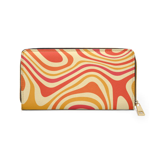 Orange Leather Wallet Women, Funky Yellow Retro Vintage Groovy Vegan Zipper Around Coins Credit Cards Pocket Cash Ladies Slim Clutch Purse