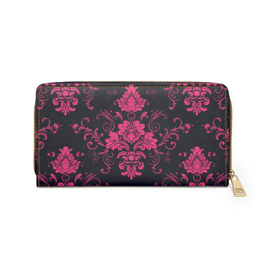 Pink Black Leather Wallet Women, Batik Geometry Vegan Zipper Zip Around Coins Credit Cards Pocket Cash Ladies Pouch Slim Clutch Purse
