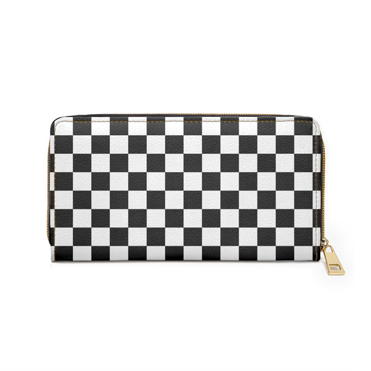 Checkered Leather Wallet Women, Black White Check Vegan Zipper Zip Around Coins Credit Cards Pocket Cash Ladies Pouch Slim Clutch Purse