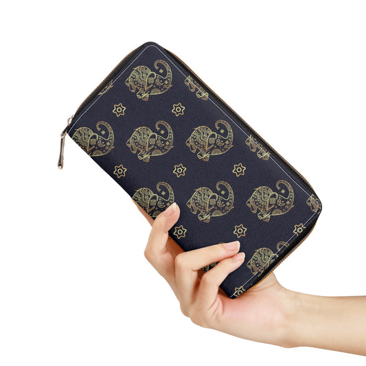 Elephants Leather Wallet Women, Black Gold Animal Vegan Zipper Zip Around Coins Credit Cards Pocket Cash Ladies Female Slim Clutch Purse
