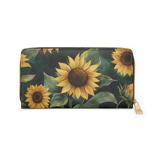 Sunflower Leather Wallet Women, Floral Flowers Vegan Zipper Zip Around Coins Credit Cards Pocket Cash Ladies Female Pouch Slim Clutch Purse