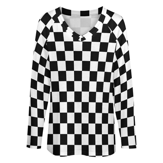 Checkered Women Long Sleeve Tshirt loose fit, Black White Check Relaxed V-neck Designer Graphic Aesthetic Ladies Female Tee Top Shirt