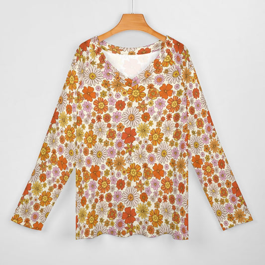 Retro Floral Women Long Sleeve Tshirt loose fit, Flowers Orange Pink Vintage Relaxed V-neck Designer Aesthetic Ladies Female Tee Top Shirt