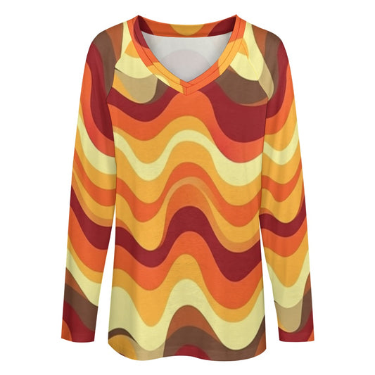 70s Retro Wavy Women Long Sleeve Tshirt loose fit, Groovy Orange Brown 1970s Vintage Relaxed V-neck Designer Ladies Female Tee Top Shirt