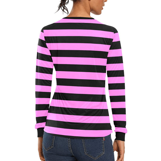 Black and Pink Striped Women Long Sleeve Tshirt, Designer Graphic Aesthetic Crew Neck Ladies Stripes Tee Shirt Top