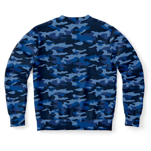 Blue Camo Sweatshirt, Camouflage Dark Navy Crewneck Fleece Cotton Sweater Jumper Pullover Men Women Adult Aesthetic Designer Top