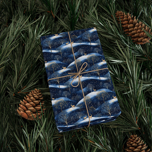 Winter Landscape Wrapping Paper, Blue Gold Deer Trees Christmas Print Snow Art Packing Holiday Gift Wrap Vintage Xmas Present Wrapper Roll