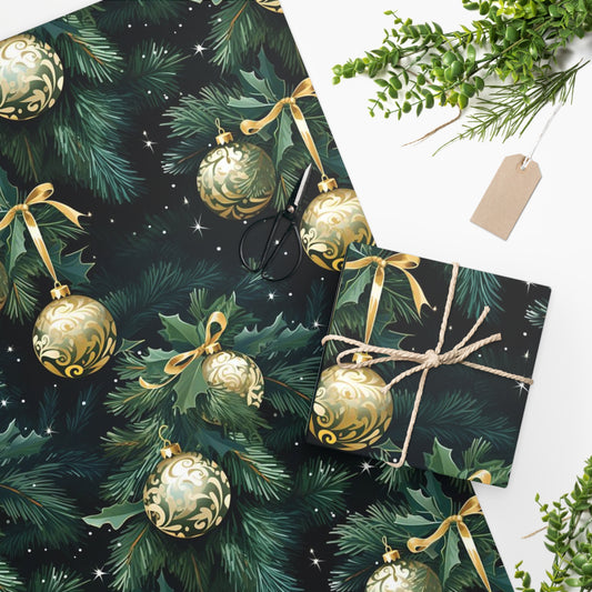Christmas Tree Wrapping Paper, Green Gold Print Art Packing Holiday Gift Wrap Decorative Vintage Xmas Present Wrapper Roll