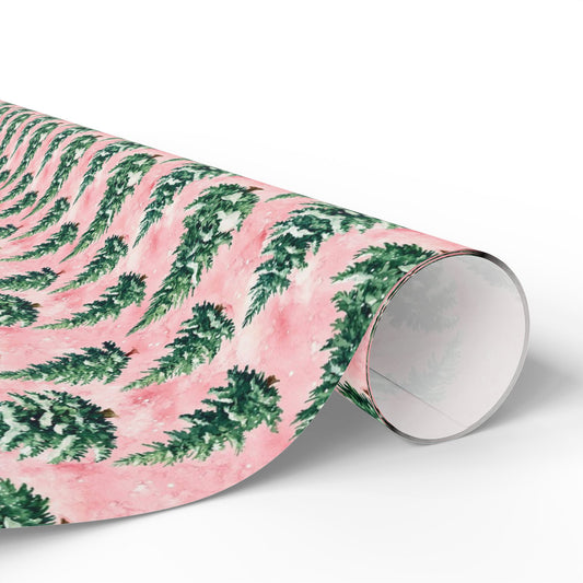 Pink Pine Trees Wrapping Paper, Christmas Print Watercolor Snow Art Packing Holiday Gift Wrap Decorative Vintage Xmas Present Wrapper Roll