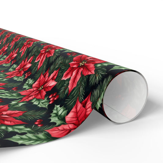 Floral Wrapping Paper, Flowers Red Green Christmas Print Poinsettias Art Packing Holiday Gift Wrap Decor Vintage Xmas Present Wrapper Roll