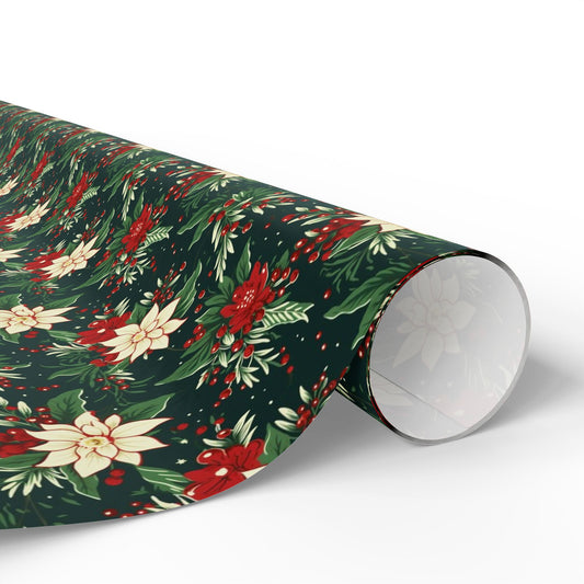 Floral Christmas Wrapping Paper, Berries Flowers Red Green White Print Art Packing Holiday Gift Wrap Decor Vintage Xmas Present Wrapper Roll