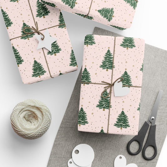 Pink Christmas Trees Wrapping Paper, Green Gold Print Art Packing Holiday Gift Wrap Decorative Vintage Xmas Present Wrapper Roll