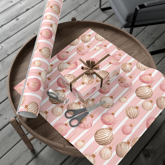 Pink Christmas Wrapping Paper, Ornaments Stripes Print Art Packing Holiday Gift Wrap Decorative Vintage Xmas Present Wrapper Roll