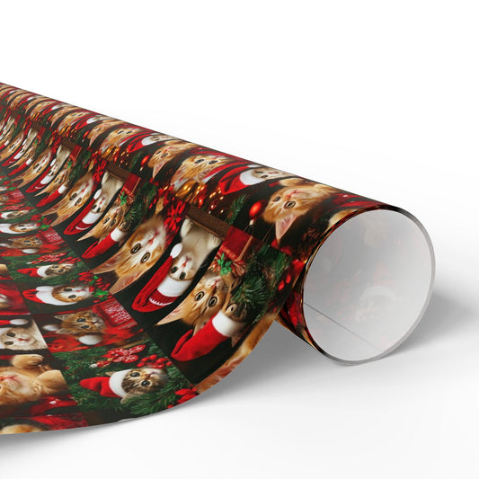 Cats Christmas Wrapping Paper, Kittens with Santa Hats Sweater Tree Print Art Packing Holiday Gift Wrap Decor Xmas Present Wrapper Roll