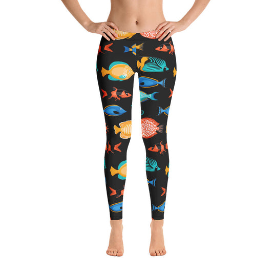 Tropical Fish Leggings, Black Angel Clown Fish Sea Ocean Printed Yoga Pants Cute Print Graphic Workout Designer Gift for Her Activewear