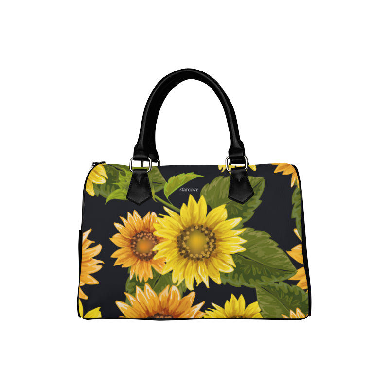 This chic and functional women's sunflower handbag purse, featuring a cute top handle barrel design, combines style and practicality. The front of this lady’s bag is crafted from canvas, while the sides are made of leather, ensuring a comfortable carry of your essentials.