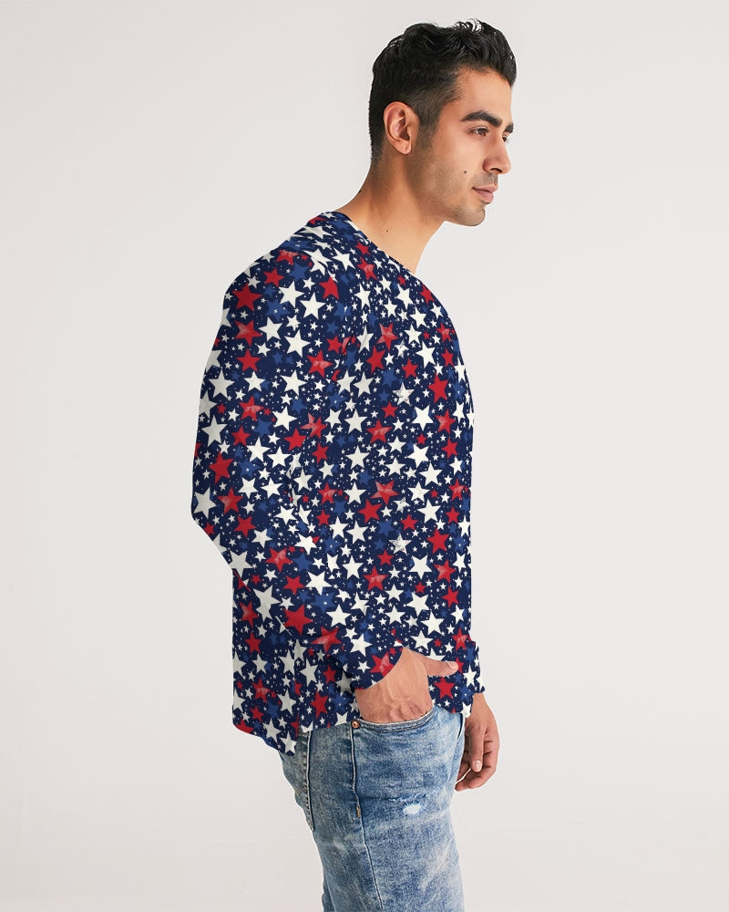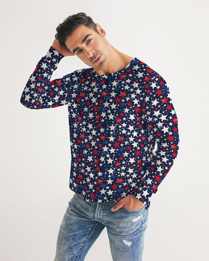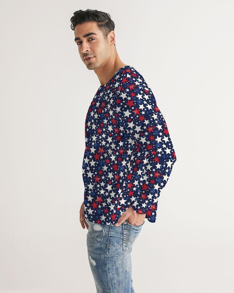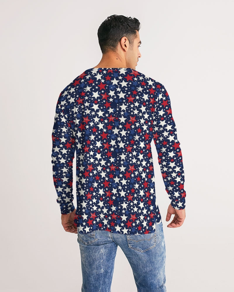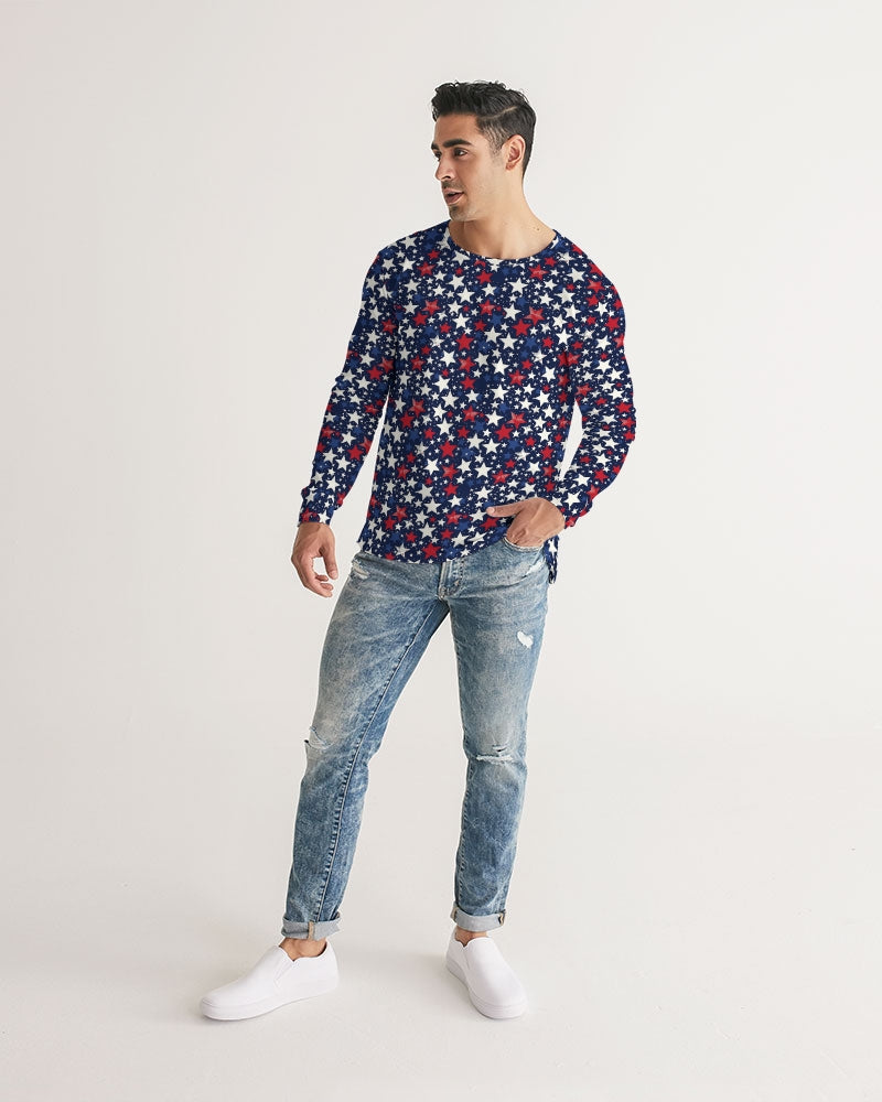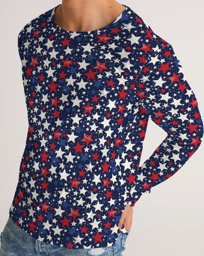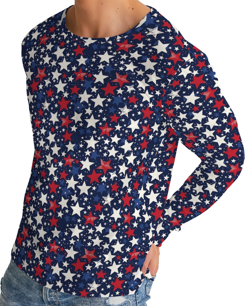 American Flag Stars Men Long Sleeve Tshirt, USA Red White Blue Patriotic Unisex Women Designer Graphic Aesthetic Printed Crew Neck Tee