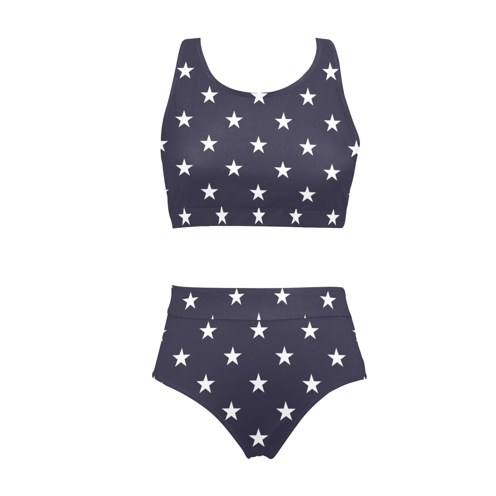 American Stars Sports Bikini Set, Navy USA Blue Patriotic High Waisted Cheeky Bottom Crop Halter Top Swimsuits Women Padded Swimwear