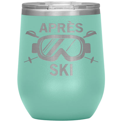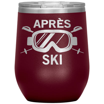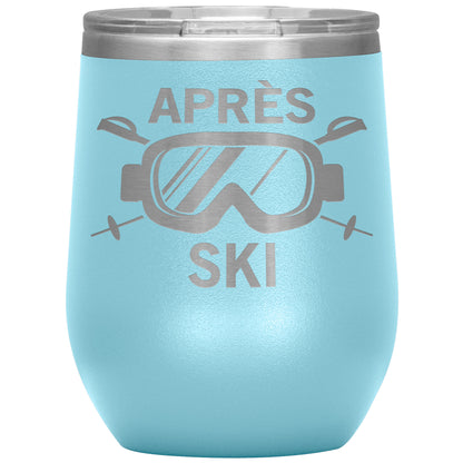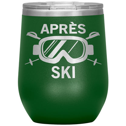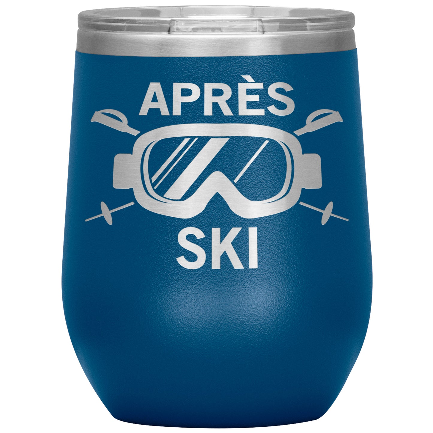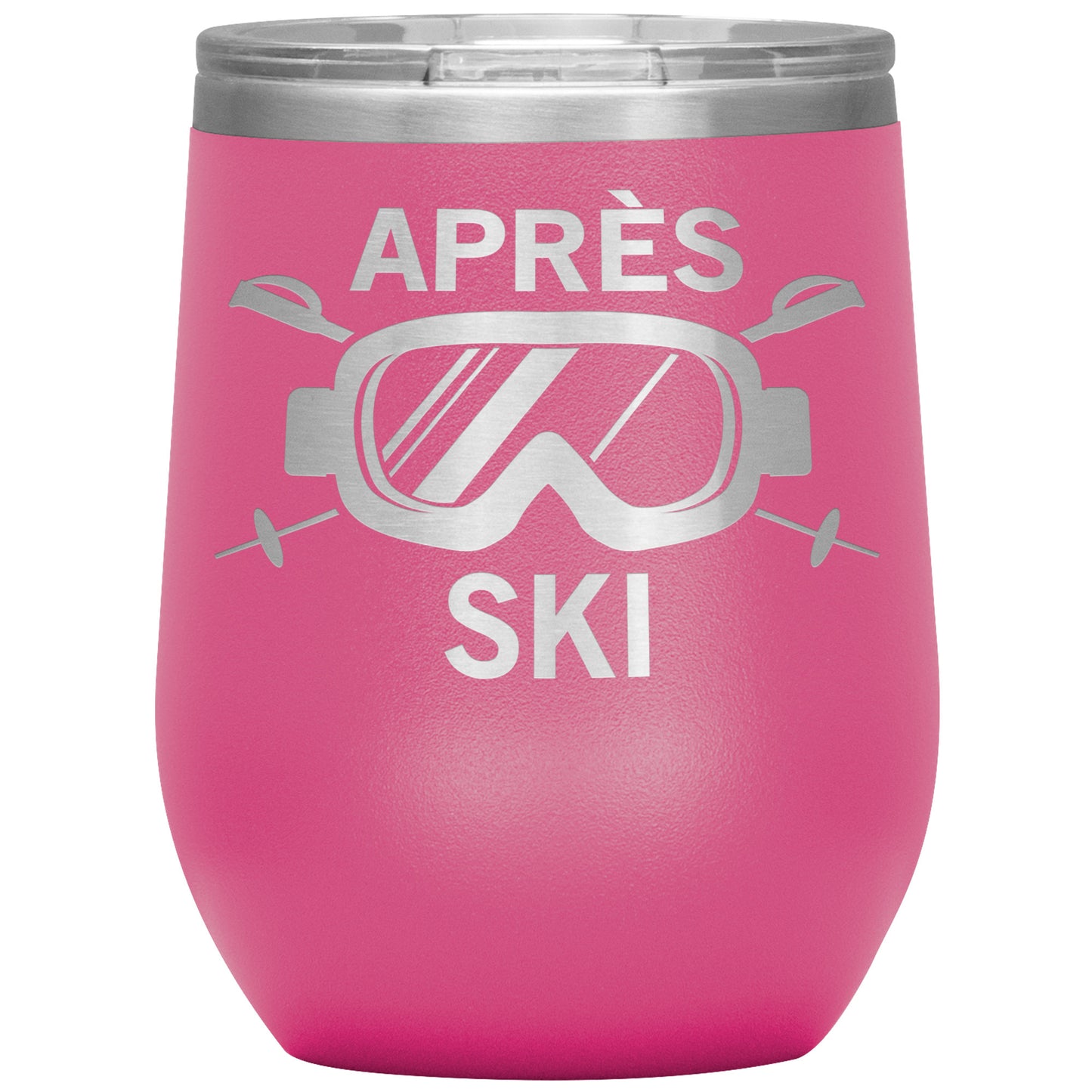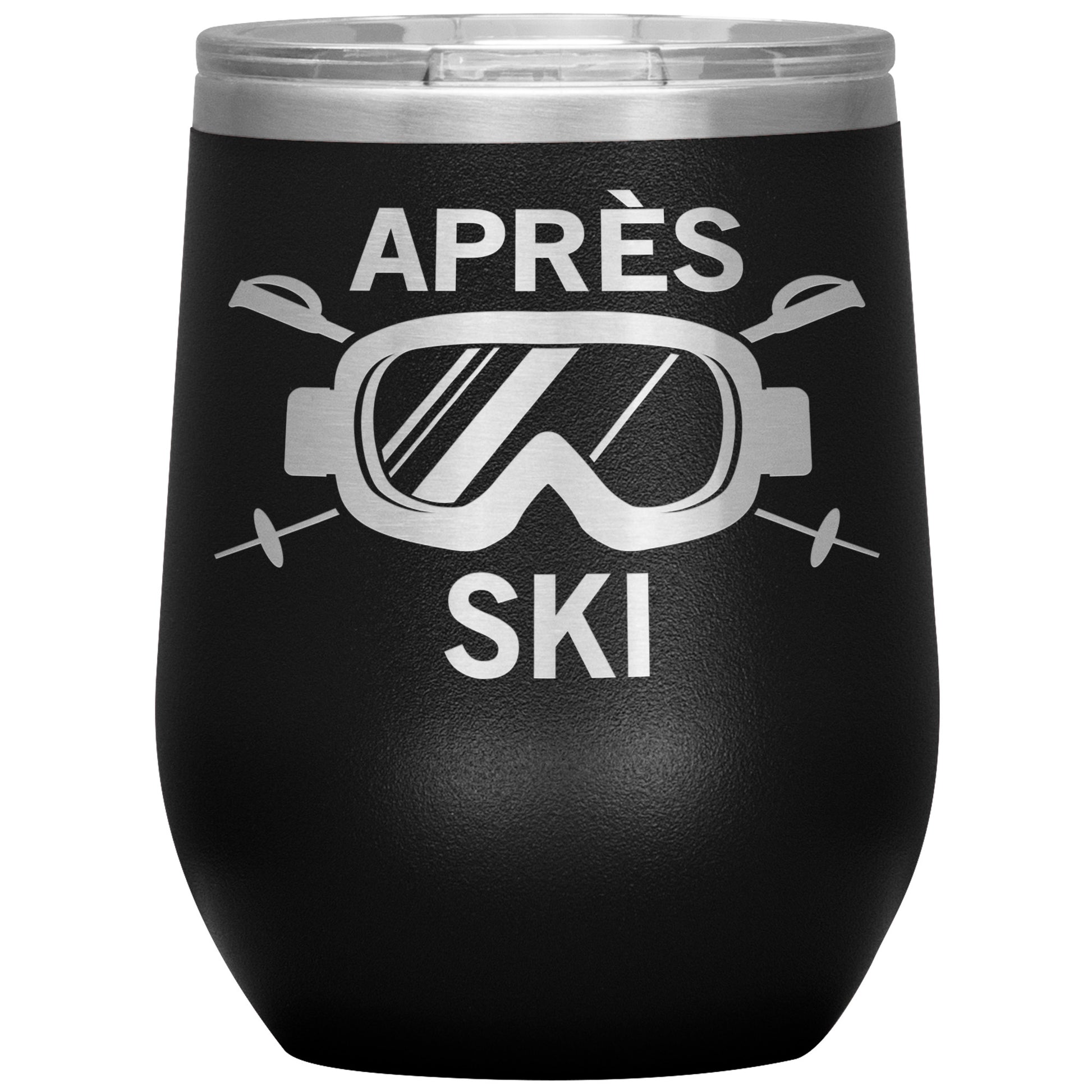 Apres Ski Wine Tumbler Mug, Skiing Decor Winter Glassware Holiday Party Resort Stemless Insulated Stainless Steel 12 oz Cup Favors Weekend