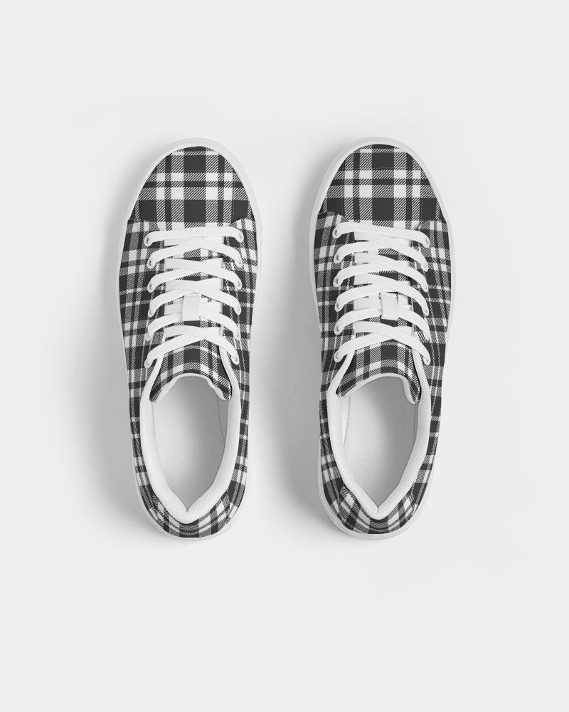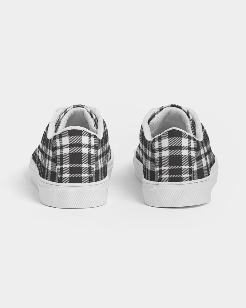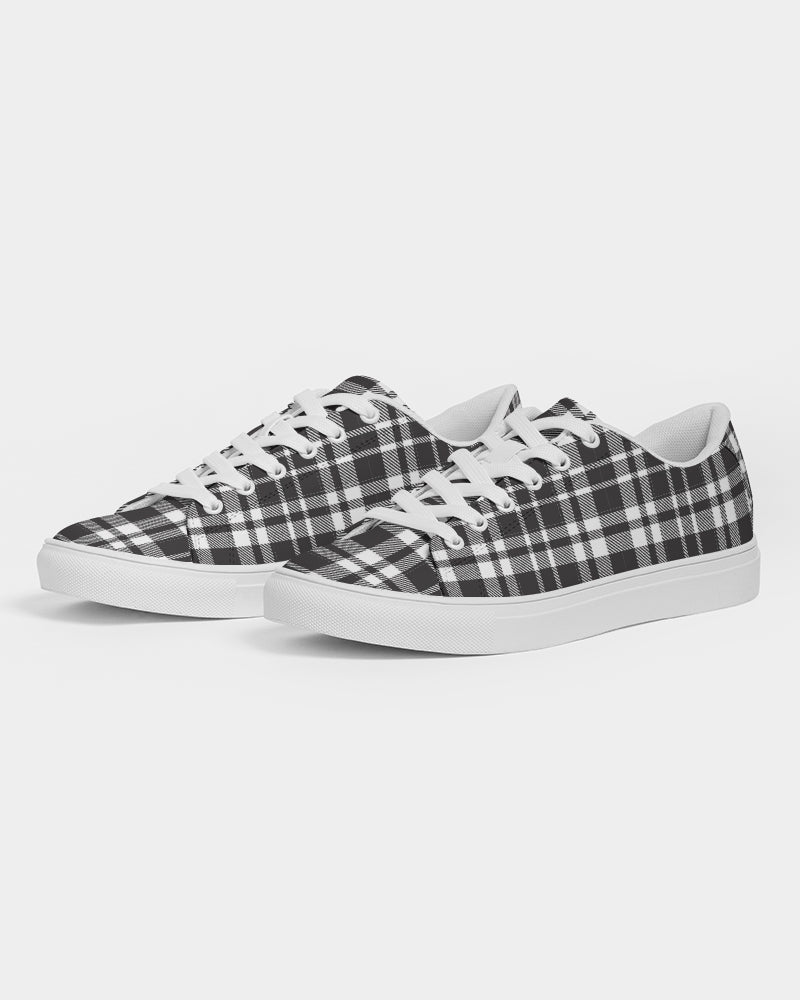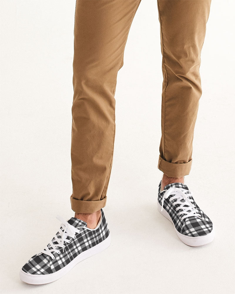 Black Buffalo Plaid Men's Vegan Leather Shoe, Black White Tartan Check Checkered Faux Leather Lace Up Breathable Sneaker