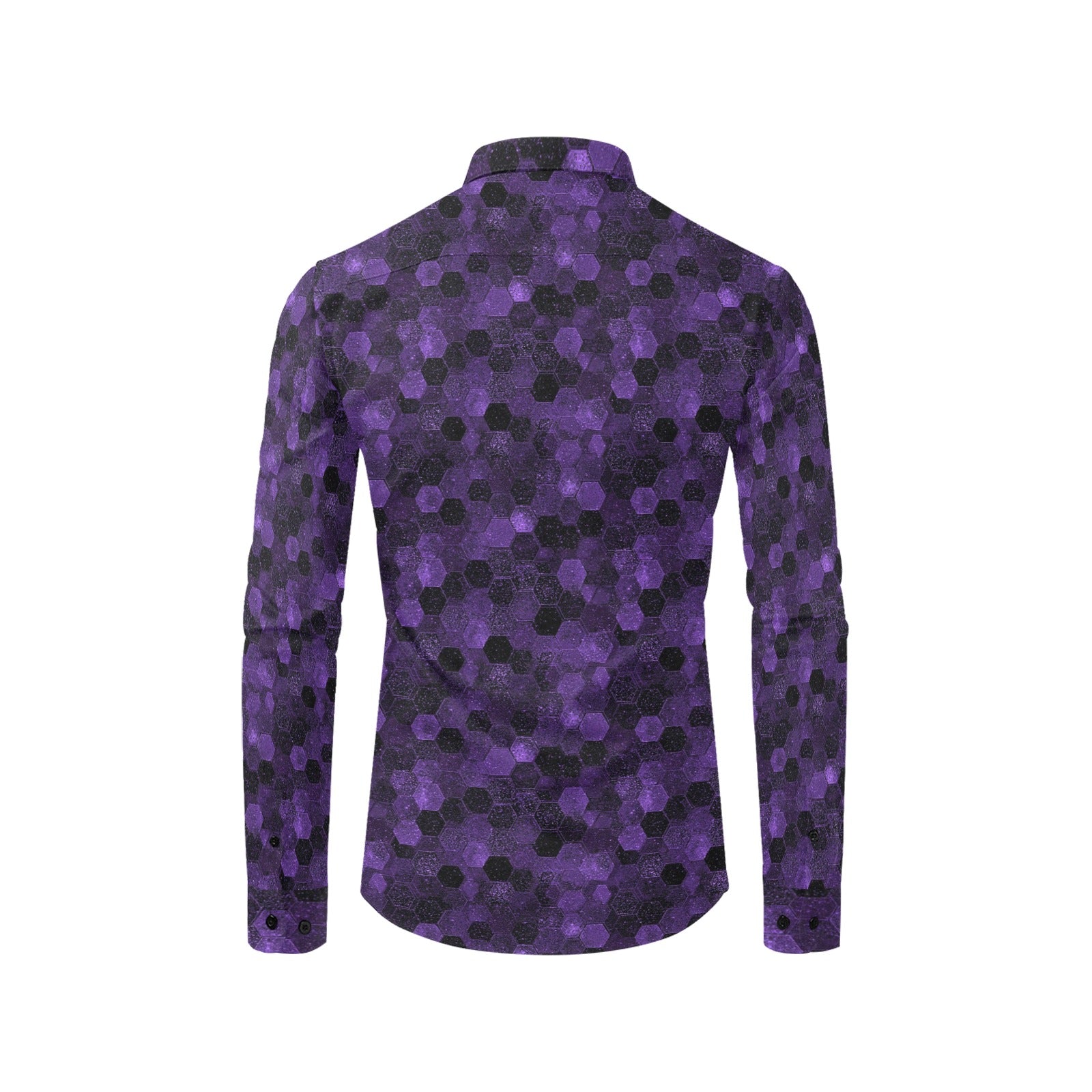 Black Purple Long Sleeve Men Button Up Shirt, Hexagonal Two Tone Combo Print Buttoned Collared Casual Dress Chest Pocket Guys Plus Size