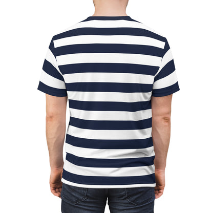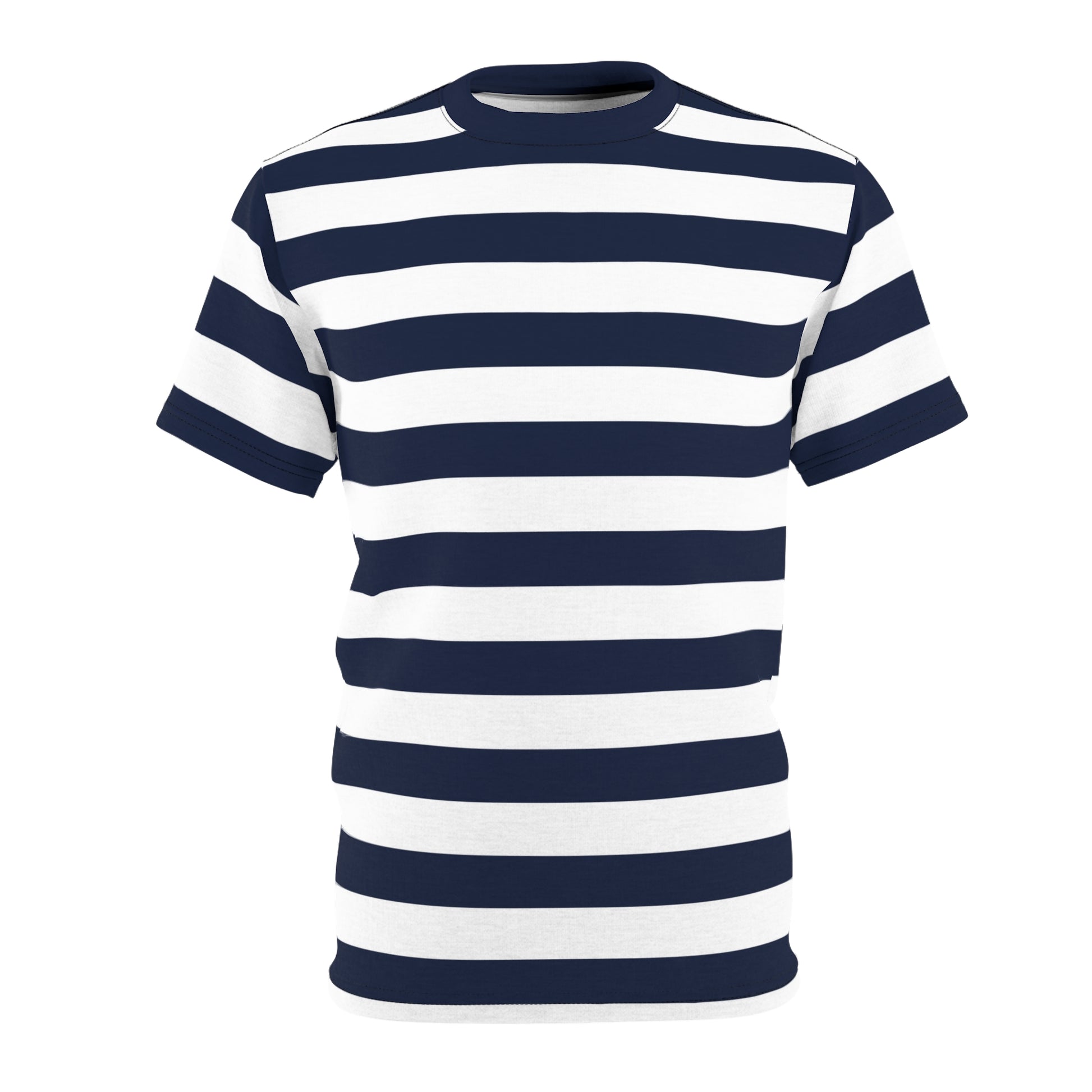 Blue and White Striped Tshirt, Navy Wide Horizontal Stripe Designer Aesthetic Crewneck Men Women Tee Top Short Sleeve Shirt