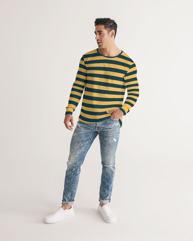 Blue and Yellow Stripes Men Long Sleeve Tshirt, Wide Striped Unisex Women Designer Graphic Aesthetic Crew Neck Tee